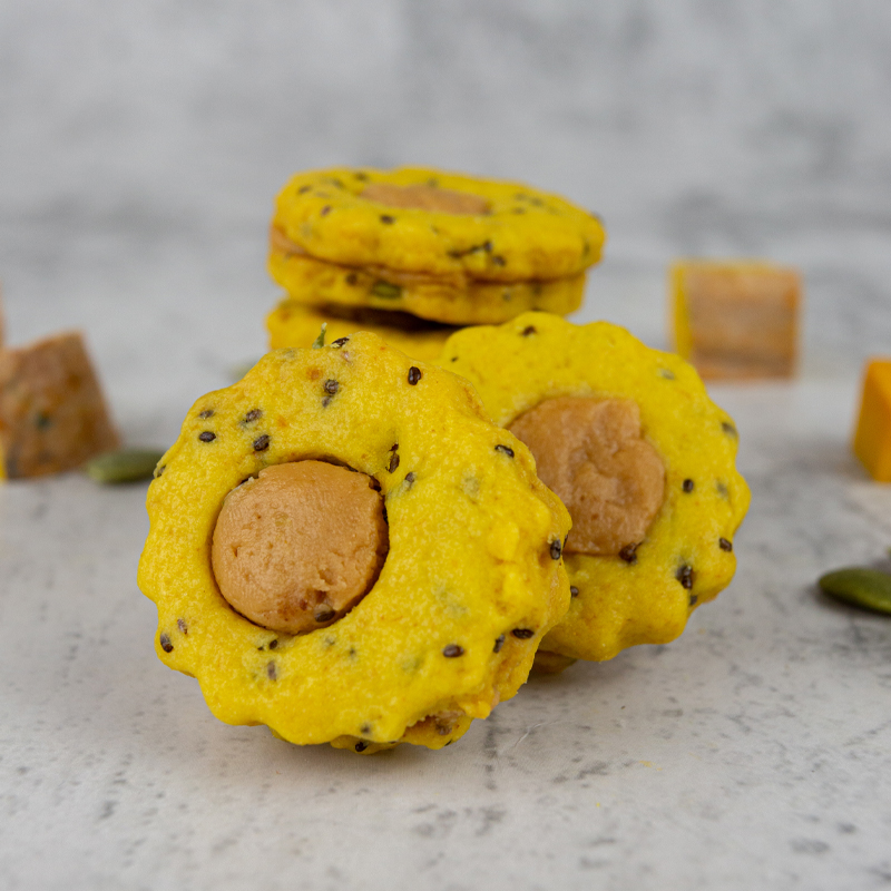 1. นำแป้งคุกกี้ที่ไม่เจาะรูตรงกลาง (แผ่นล่าง) ที่เตรียมไว้ มาทาด้วยไส้สวีทพีนัท